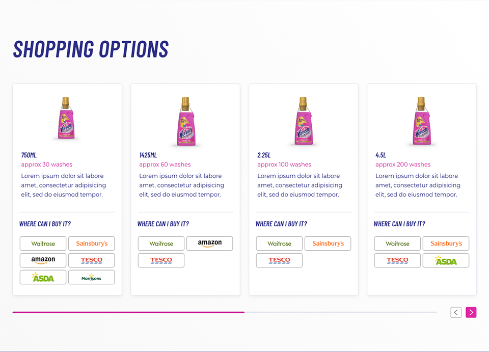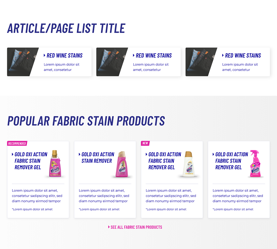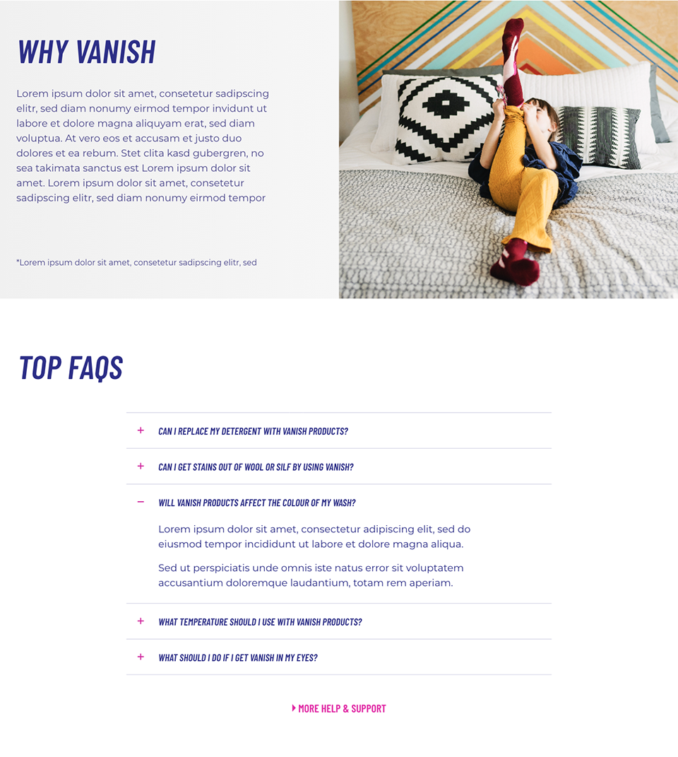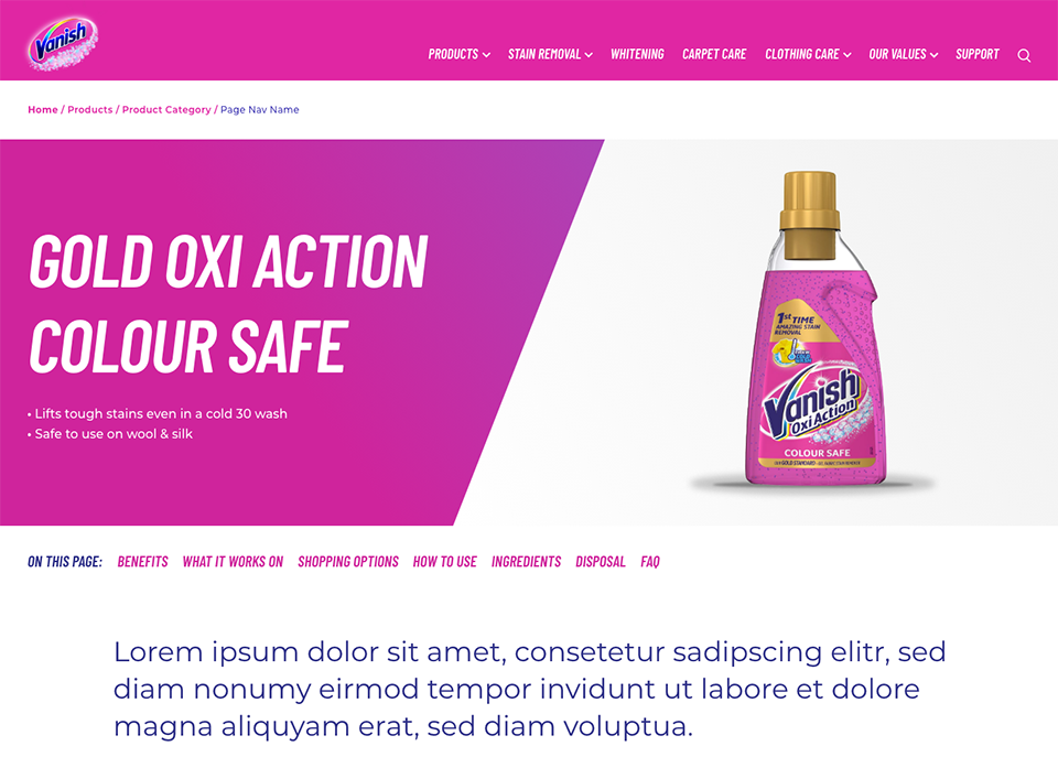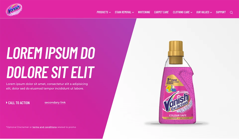 The 2021 rebranding of Vanish presented a unique set of challenges, particularly in the redesign of its websites. One of the primary hurdles was the business team's limited experience with digital products, which required the UX team to play an advisory role throughout the process. Additionally, two different external creative agencies had delivered overlapping yet inconsistent concepts, which needed to be merged and aligned into a single, cohesive digital direction. The brand’s existing digital assets suffered from a cluttered visual identity, including over 20 inconsistent shades of pink and multiple conflicting typefaces, demanding a significant cleanup effort to establish clarity and consistency. Despite these complexities, the UX team worked closely with stakeholders to shape a streamlined and modern design system tailored for digital environments.